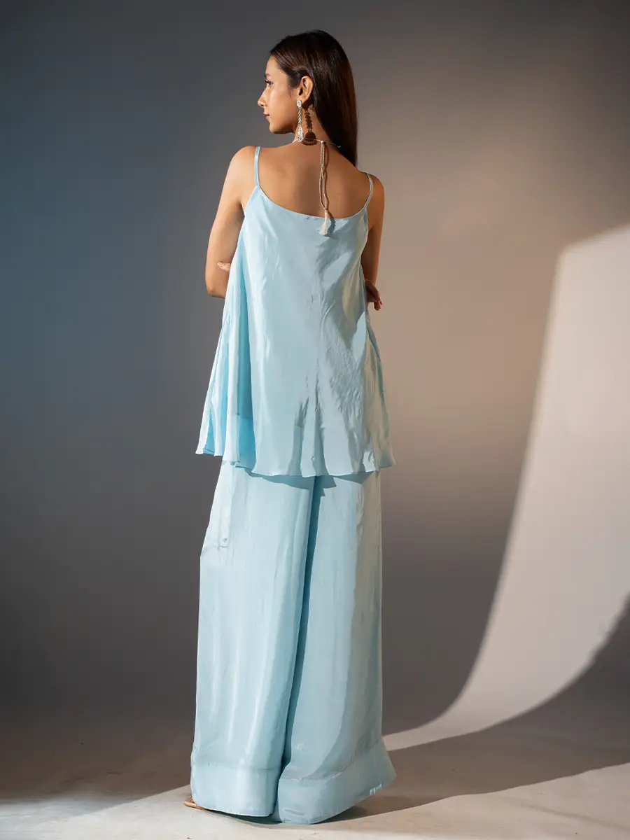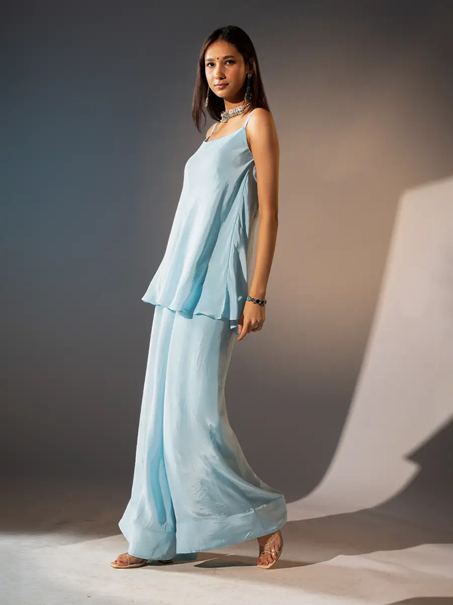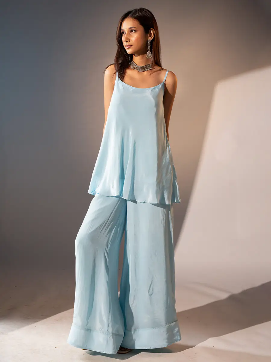 Top: Fabric: Natural crepe Neckline: Round neck with shoulder straps Print & Pattern: Solid Fit Type: straight shape Color: Blue Care Instructions: Dry clean only Sharara Pants:  Fabric: Natural crepe Print & Pattern: solid Fit Type: sharara Closure: Front belt with side zip and back elastic Color: Blue Care Instructions: Dry clean only